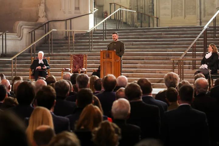 2023年2月8日,在英国伦敦,乌克兰总统泽连斯基在议会发表讲话。新华社发