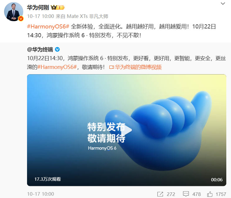 华为常务董事、终端BG董事长余承东也在发布会当天10点又发文预告:HarmonyOS 6 来了!鸿蒙操作系统 6 · 特别发布,今天14:30,我们直播间见!