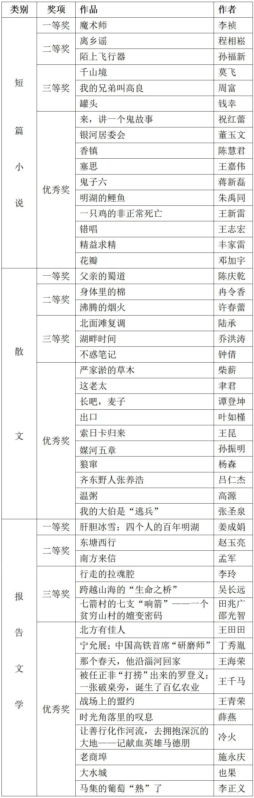 本次大赛设立短篇小说、散文、报告文学三大类别。经初评、复评、终评三轮评选,按照公平、公正、择优的原则,经过匿名定评和无记名投票,最终每个类别分别评出:一等奖1名,二等奖2名,三等奖3名,优秀奖10名,共计48名,现将名单予以公示。如公示名单中有不符合首届“青未了”文学创作大赛征稿要求的情况,请于公示期间向首届“青未了”文学创作大赛组委会如实反映并提供相关证据,反映情况需实名并提供联系方式。