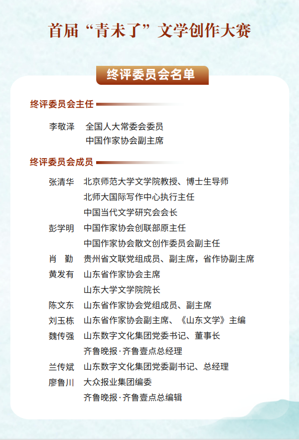 2025年10月20日,首届“青未了”文学创作大赛终评会在山东济南举行,评选产生获奖作品48篇,正式进入公示阶段。