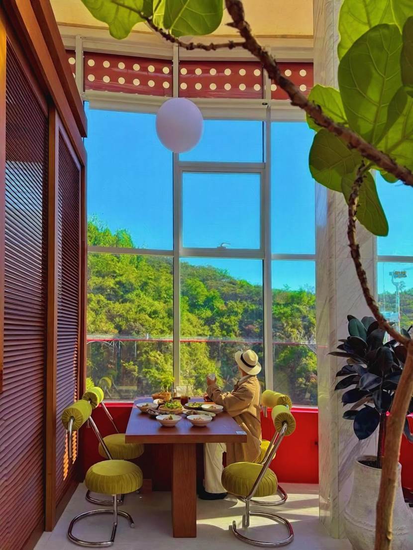 在“雾·涧山Mist”高空餐厅,远望山峦叠翠;