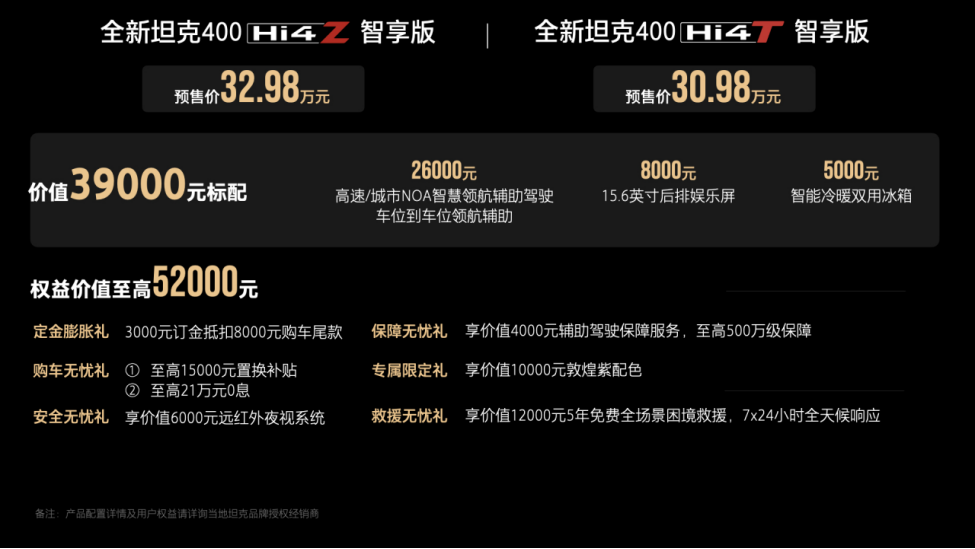 目前全新坦克400 Hi4-Z智享版、全新坦克400 Hi4-T智享版已同步开启预售,预售期间预订可享6重尊崇权益,全新坦克400以满满诚意为年轻用户体验潮酷越野带来惊喜购车优惠。