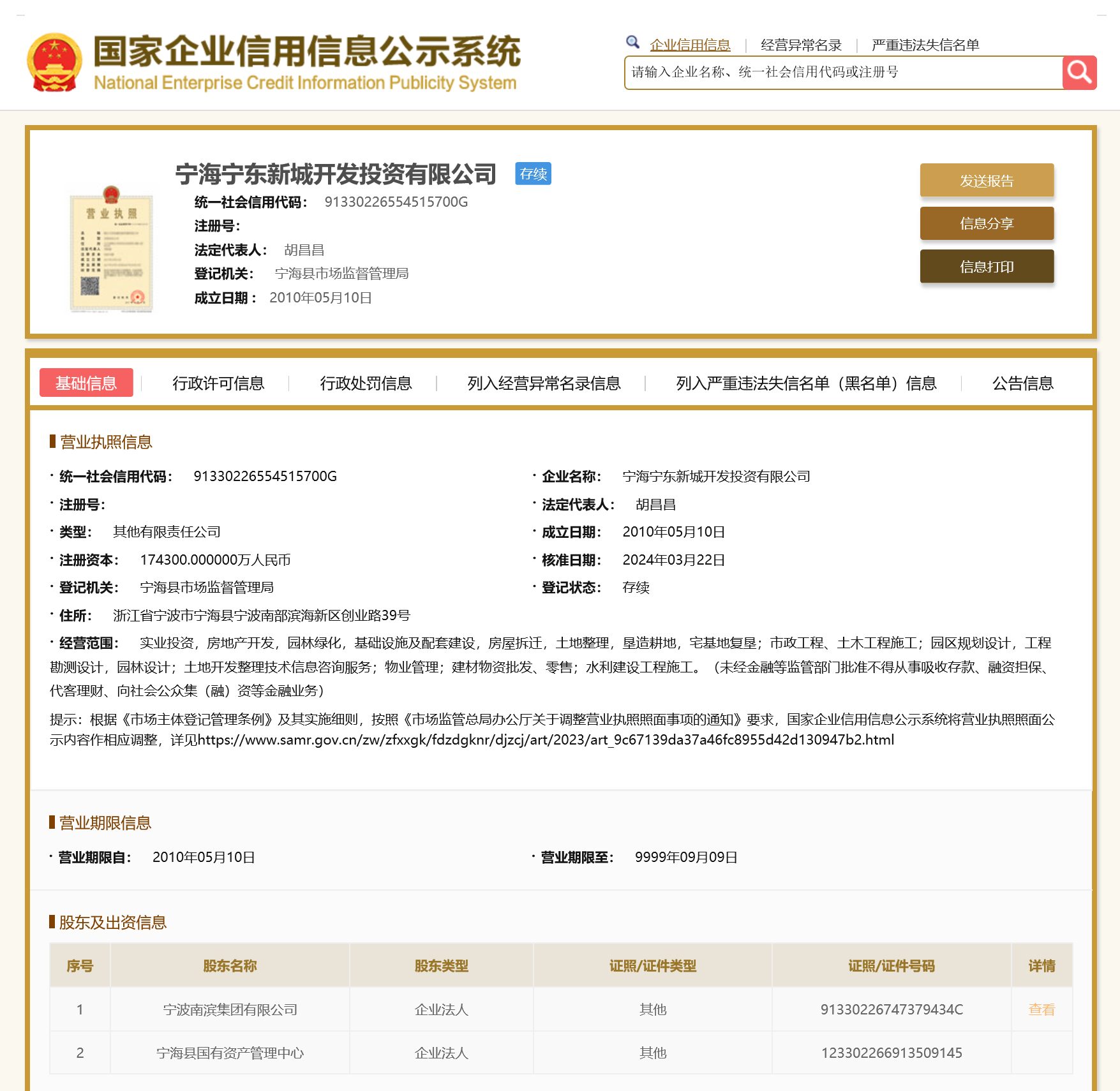 公开信息显示,宁海宁东新城开发投资有限公司成立于2010年5月10日,法定代表人胡昌昌,股东为宁波南滨集团有限公司和宁海县国有资产管理中心。