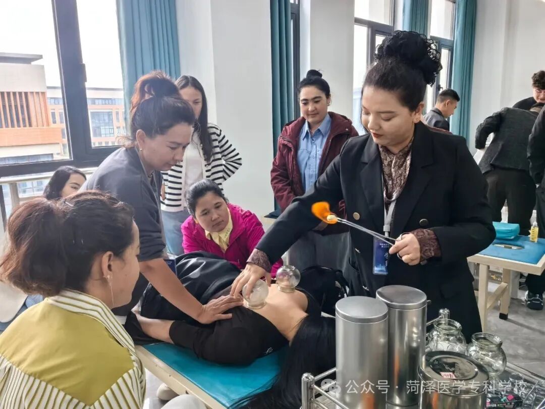 菏泽医专遴选中医药系理论扎实、临床经验丰富的专家教授组建授课团队,采用“专题讲授+实操演练+案例研讨”模式开展教学。培训课程包括中医药基础理论、经络腧穴等核心知识,推拿、拔罐、艾灸、毫针刺法、刮痧等实用技术,以及乡村常见病诊疗规范,课程体系兼具理论深度与实践价值,精准对接乡村医生日常诊疗场景,助力提升临床服务能力。培训期间,学员们始终保持高昂的学习热情,课堂上专心记录、踊跃提问,实操中相互切磋、反复练习,晚间自发组织病例讨论,将喀什地区基层诊疗案例与所学技术结合分析,形成了良好的研学氛围。
