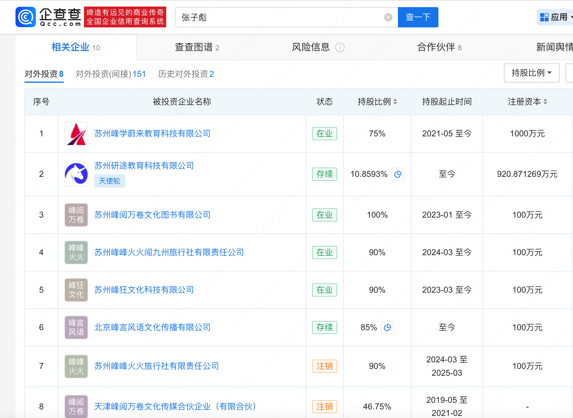 据企查查信息显示,(张子彪)张雪峰名下关联10家企业,8家为存续状态,包括苏州峰学蔚来教育科技有限公司、苏州研途教育科技有限公司等,此外其间接投资有超150家企业,行业涉及科学研究和技术服务业等。