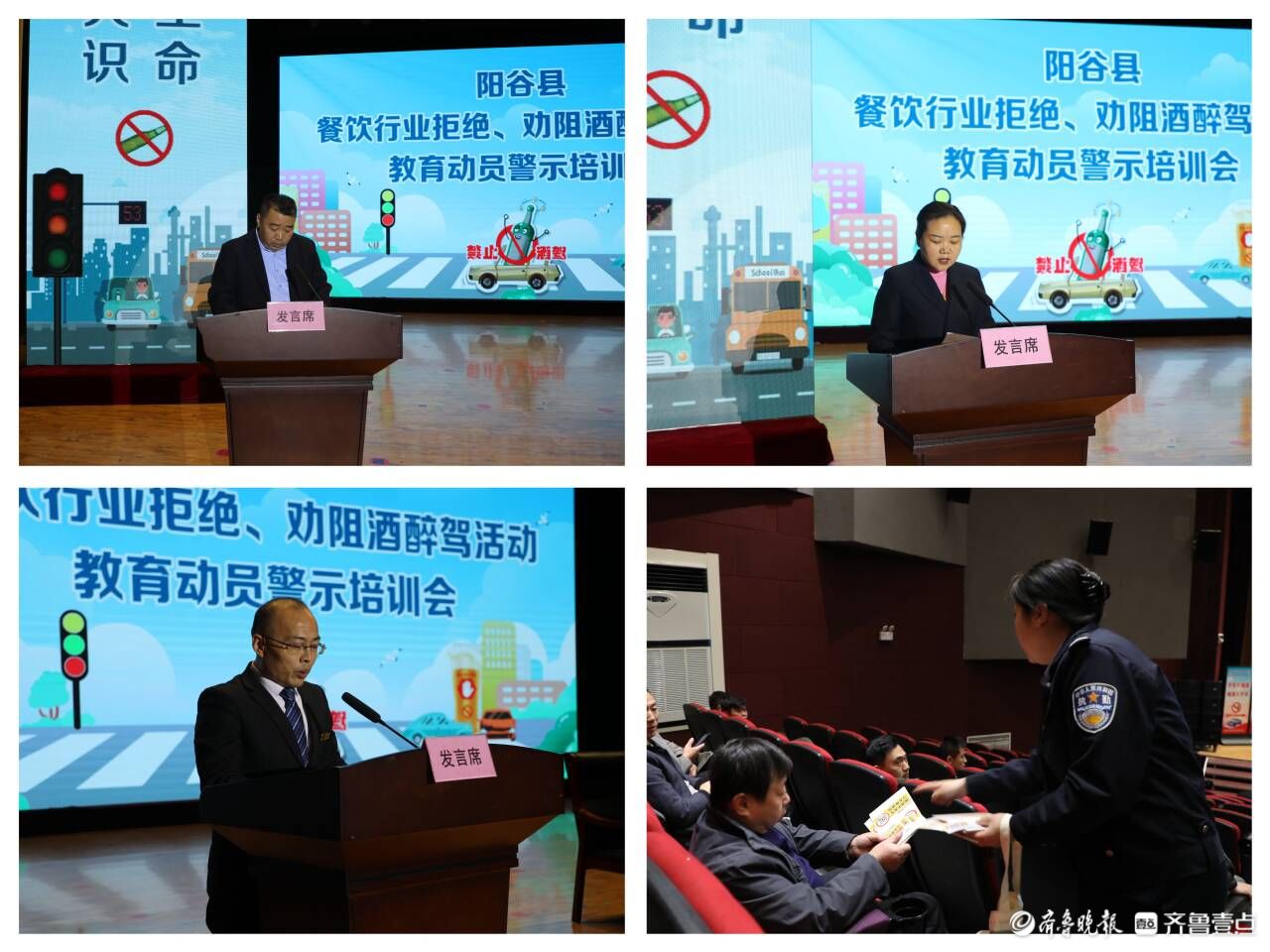 10月22日,阳谷县组织召开餐饮行业拒绝、劝阻酒醉驾活动教育动员警示培训会议,会议由县市场监督管理局、县公安局联合发起,县市场监管局副局长姚贵国、县公安局交管大队政委聂岱海,博济桥、侨润、狮子楼等三个办事处交安办负责人、办事处所辖市场监管所、派出所负责同志及500余名餐饮从业人员参加活动。