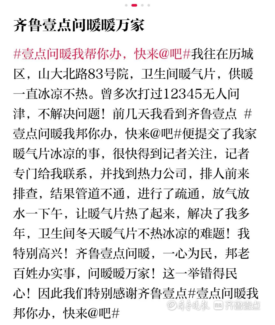 从2018年起,连续八年,每逢供暖季,齐鲁晚报·齐鲁壹点都会开通“壹点问暖”在线服务,邀请全省16市有责任、有担当的热企上线入驻,了解和解决群众在供暖过程中遇到的实际问题。与此同时,齐鲁晚报·齐鲁壹点在16市的问暖记者也会深入到居民小区和供热单位,对群众的用暖问题进行全方位立体报道,并协调热企和供热主管部门,推动问题解决。