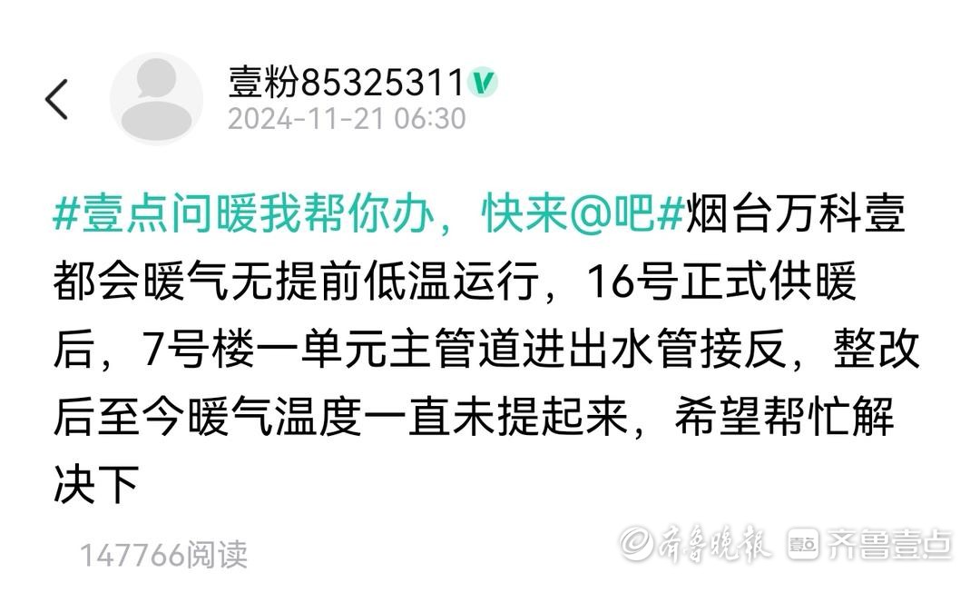 2024年11月,烟台正式开始供暖后,家住烟台万科壹都会小区的壹粉李女士家直到21日暖气仍然不热。收到李女士发来的求助后,经烟台问暖记者协调,烟台热力的工作人员到现场查看,发现该小区是第一年供暖,管道存在气堵和污堵的问题。最后,业主、物业及热企三方沟通后确定了解决方案。12月中旬,问暖记者回访发现,李女士家的暖气已经热了,温度达到25℃左右。