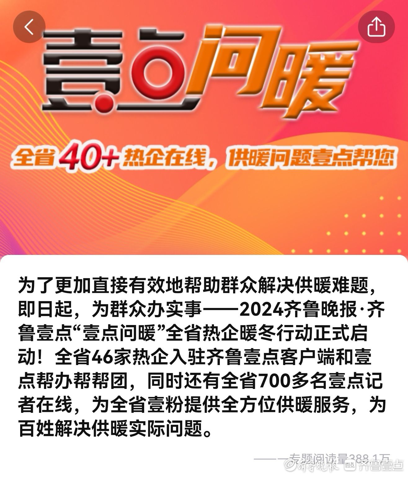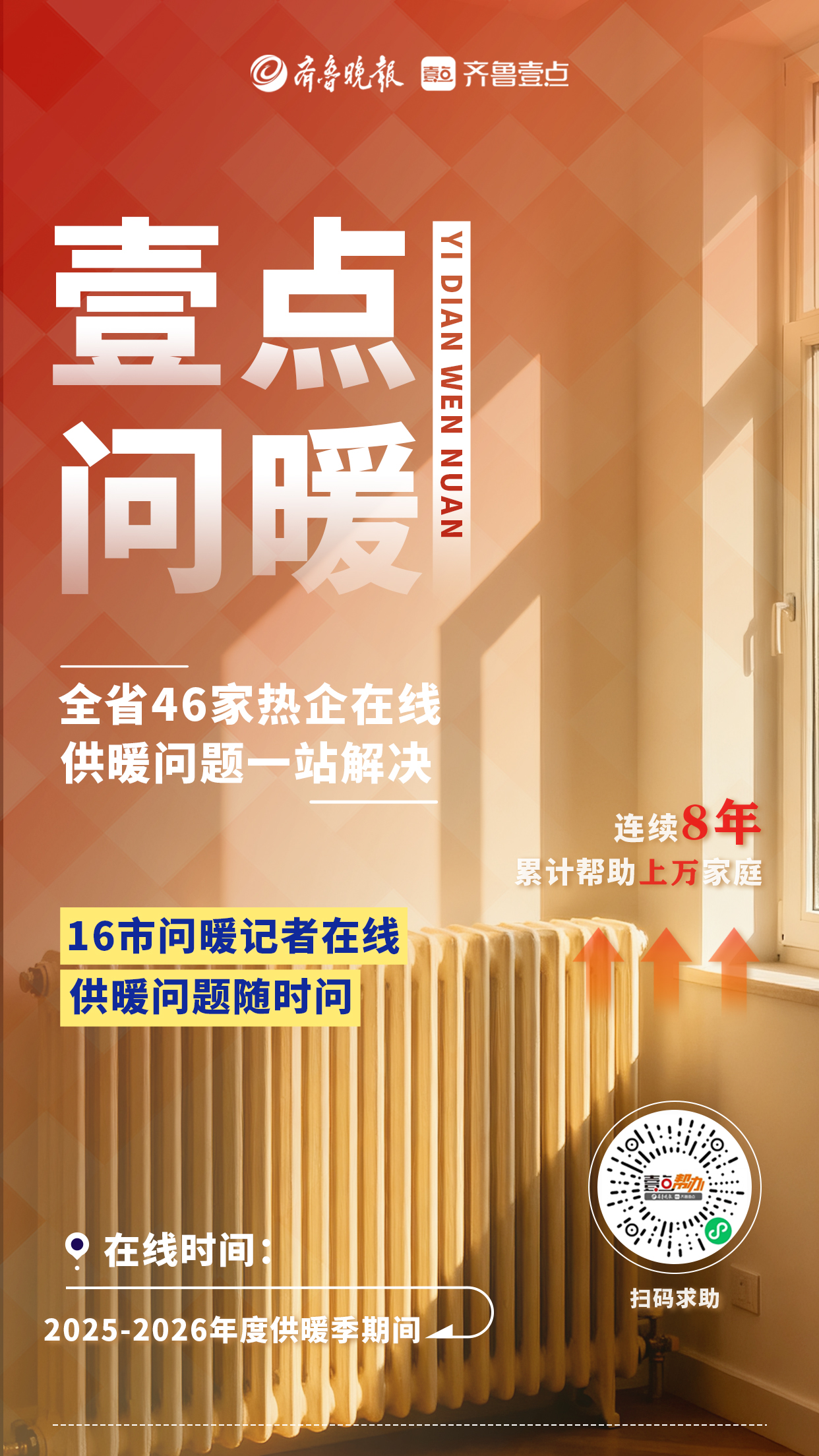 为切实帮助群众解决用暖难题,即日起,“为群众办实事”——齐鲁晚报·齐鲁壹点2025“壹点问暖”全省热企暖冬行动正式启动!全省46家供热企业入驻齐鲁壹点情报站和壹点帮办“帮帮团”,同时还有16市问暖记者在线,为广大壹粉提供全方位的问暖服务,解决供暖中遇到的实际问题,守护这个冬天的温暖。