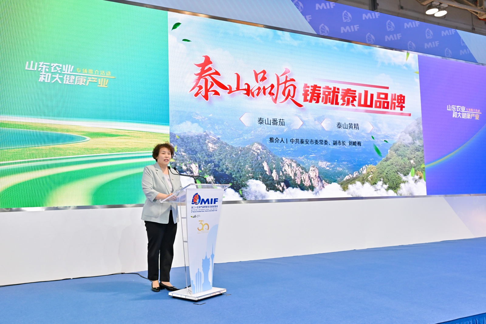 泰安市委常委、副市长刘峰梅推介泰山番茄与泰山黄精产业。