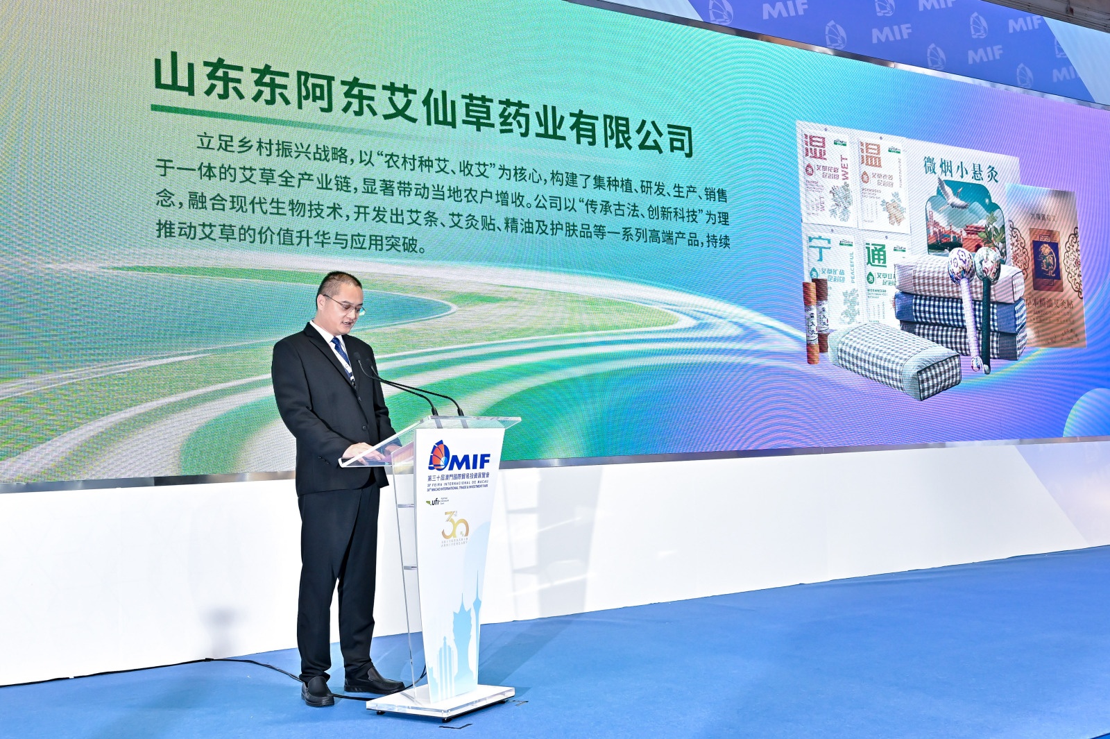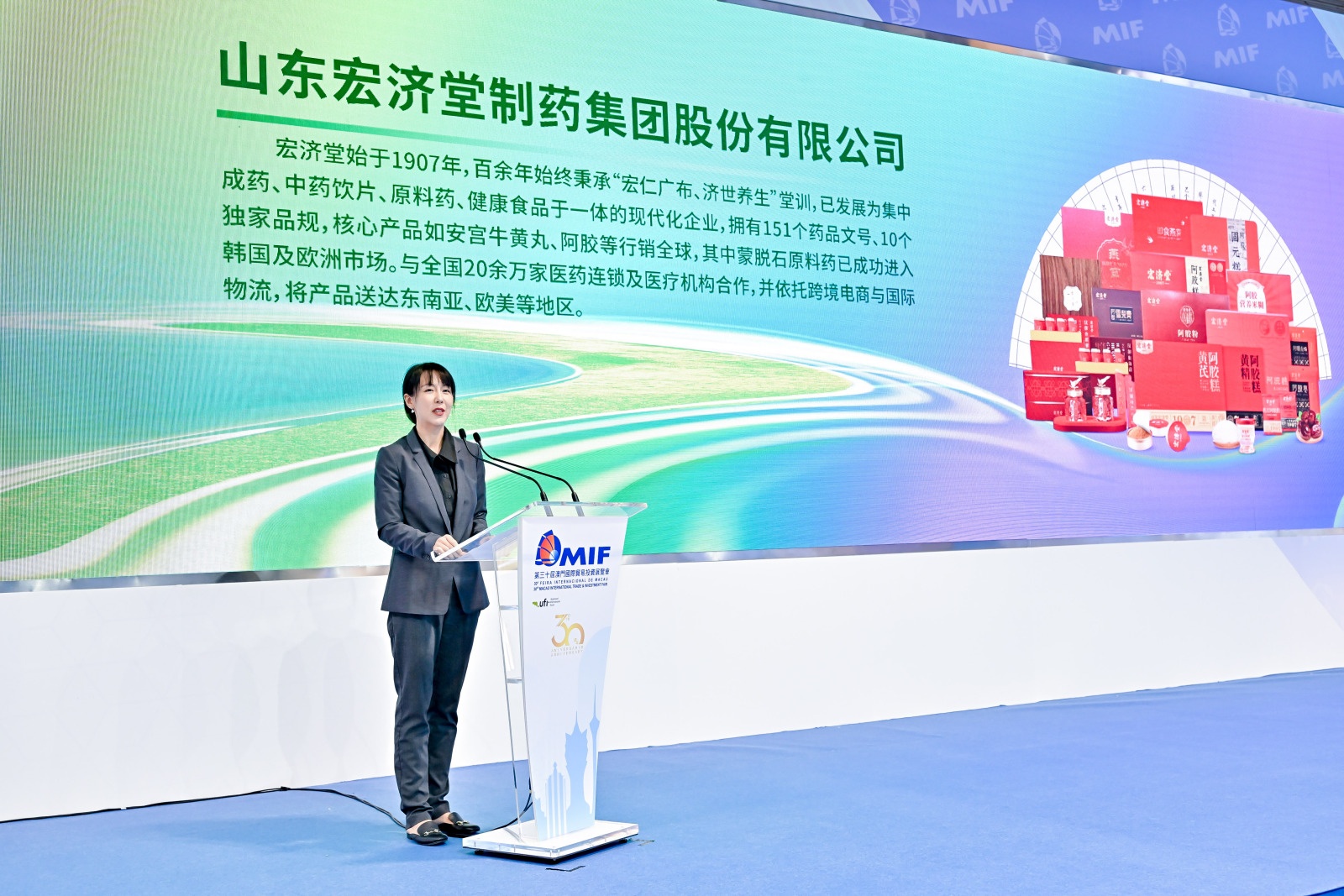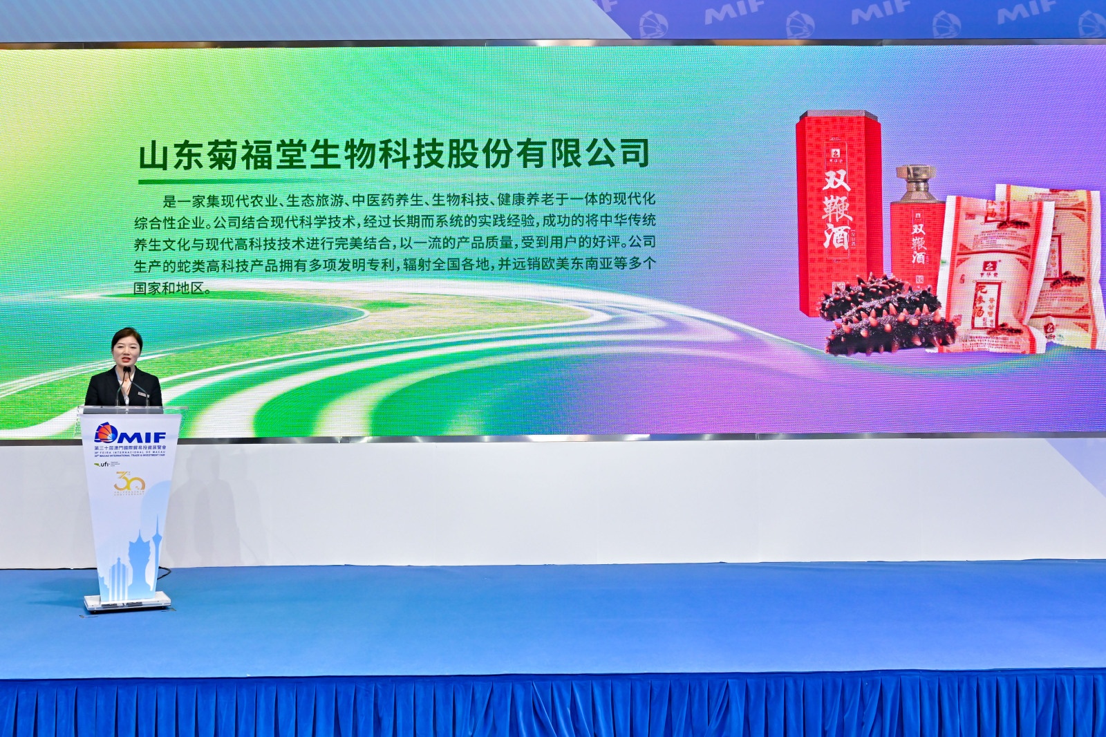 在优特产品推介环节,宏济堂国际贸易公司、威海市东旭西洋参有限公司、威海银泽生物科技股份有限公司、泰安市泰山景区无恙堂健康产业有限公司、山东东阿东艾仙草药业有限公司、山东广成堂健康产业发展有限公司、山东得利斯食品股份有限公司、山东菊福堂生物科技股份有限公司、山东尧王控股集团有限公司等山东企业携核心产品轮番亮相。葵仁护肾饮、参精系列产品、海马健康食品、泰山黄精产品、九顶莲花艾产品、药食同源茶饮、得利斯肉制品、蛇类中医药健康产品、中医药产品等农业与大健康产品吸引现场澳门采购商。