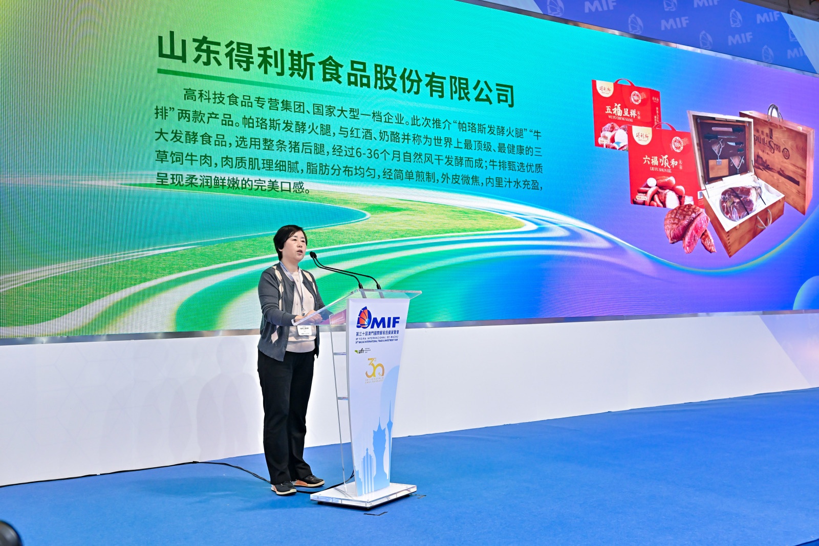山东得利斯食品股份有限公司海外事业部总经理刘海瑛进行肉制品推介。