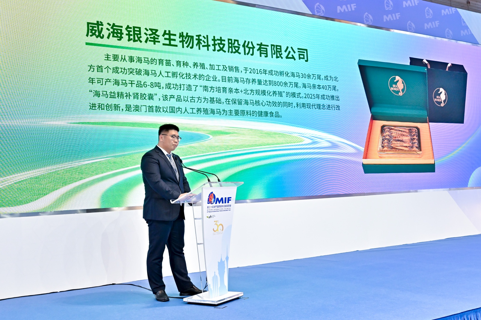 威海银泽生物科技股份有限公司总经理俞青林进行海马健康食品推介。