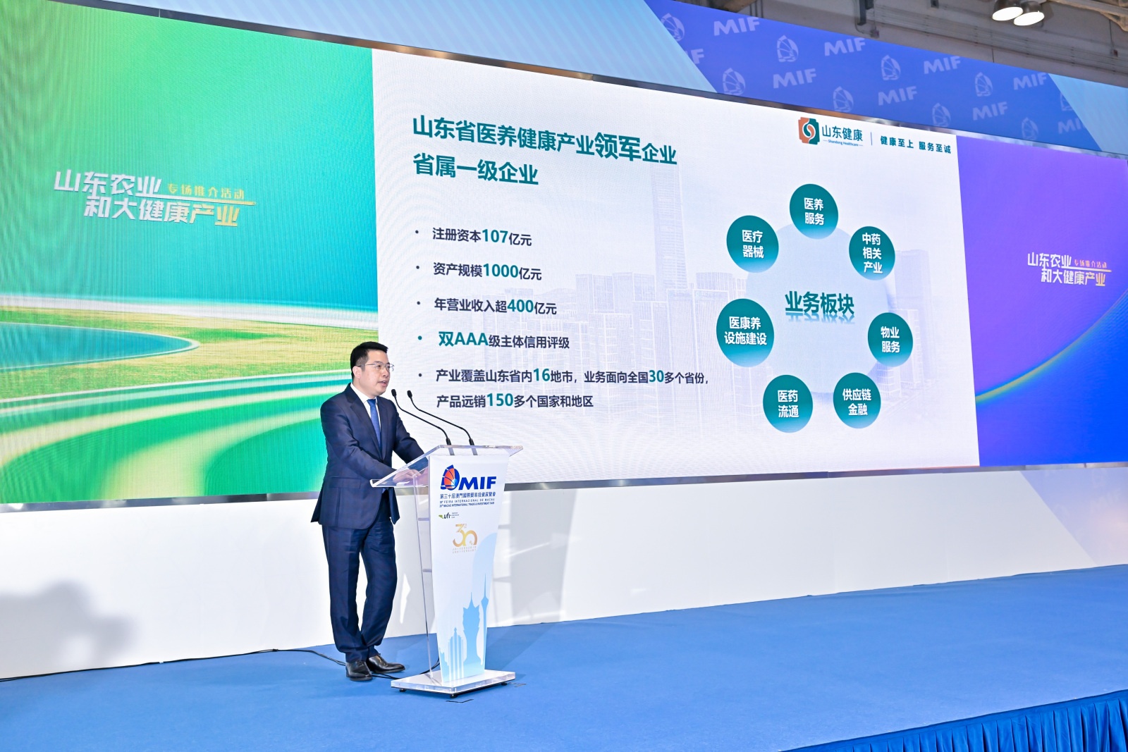 山东健康集团董事长王振江则从产业布局与核心优势角度,分享了集团在医养健康领域的实践与成果。作为山东省医养健康产业的领军企业,山东健康集团资产总额近1000亿元,年营业收入超400亿元,拥有医养服务、医疗器械、中医药相关产业、医康养设施建设、物业服务、医药流通、供应链金融七大业务板块。王振江在推介中重点介绍了集团在医养服务、医疗器械及中医药相关产业三大核心板块的布局与优势。他表示,医养服务、医疗器械、中医药相关产业市场前景广阔、发展潜力巨大,集团期待与社会各界开展广泛合作。
