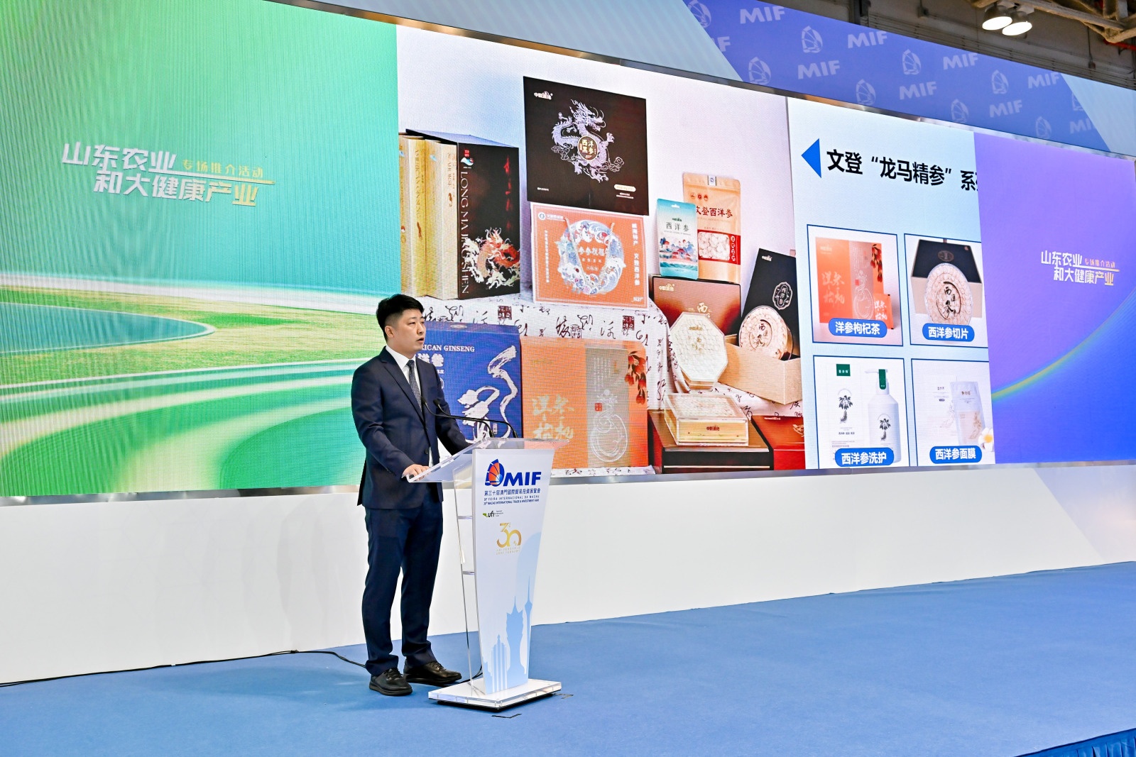 威海市文登区副区长花健推介威海西洋参和海马产业。