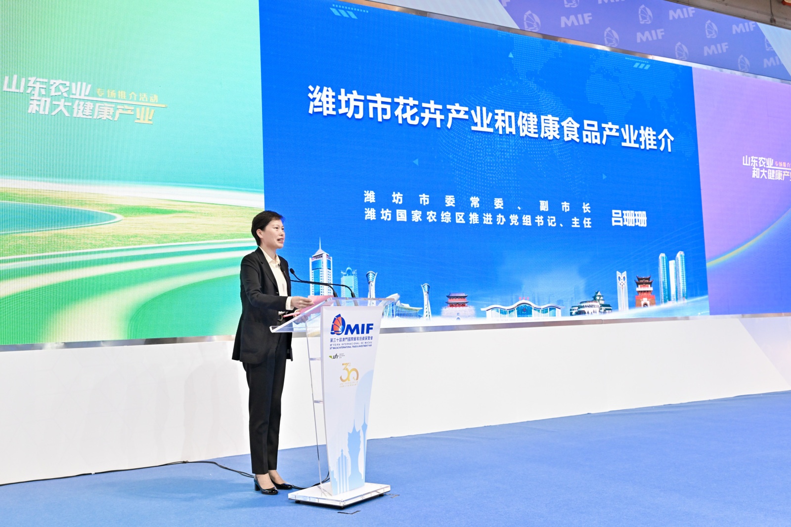 潍坊市委常委、副市长吕珊珊推介花卉产业与健康食品产业。