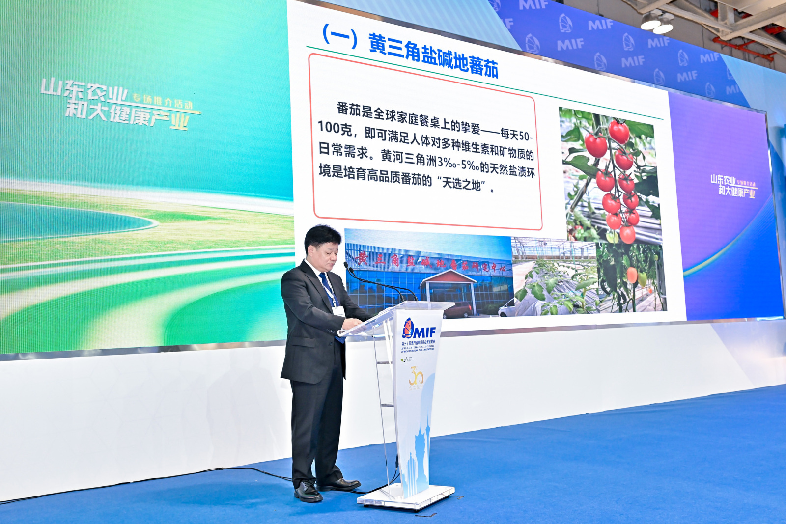 黄三角农高区现代农业局局长杨月明推介盐碱地藜麦与盐碱地番茄产业。