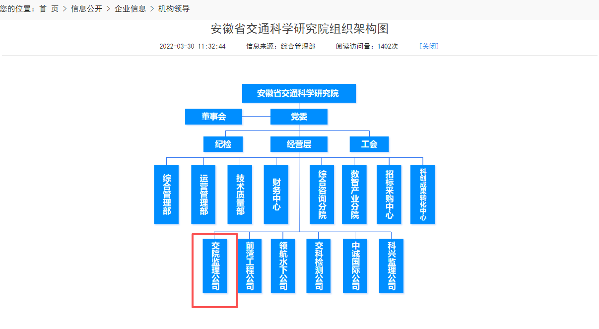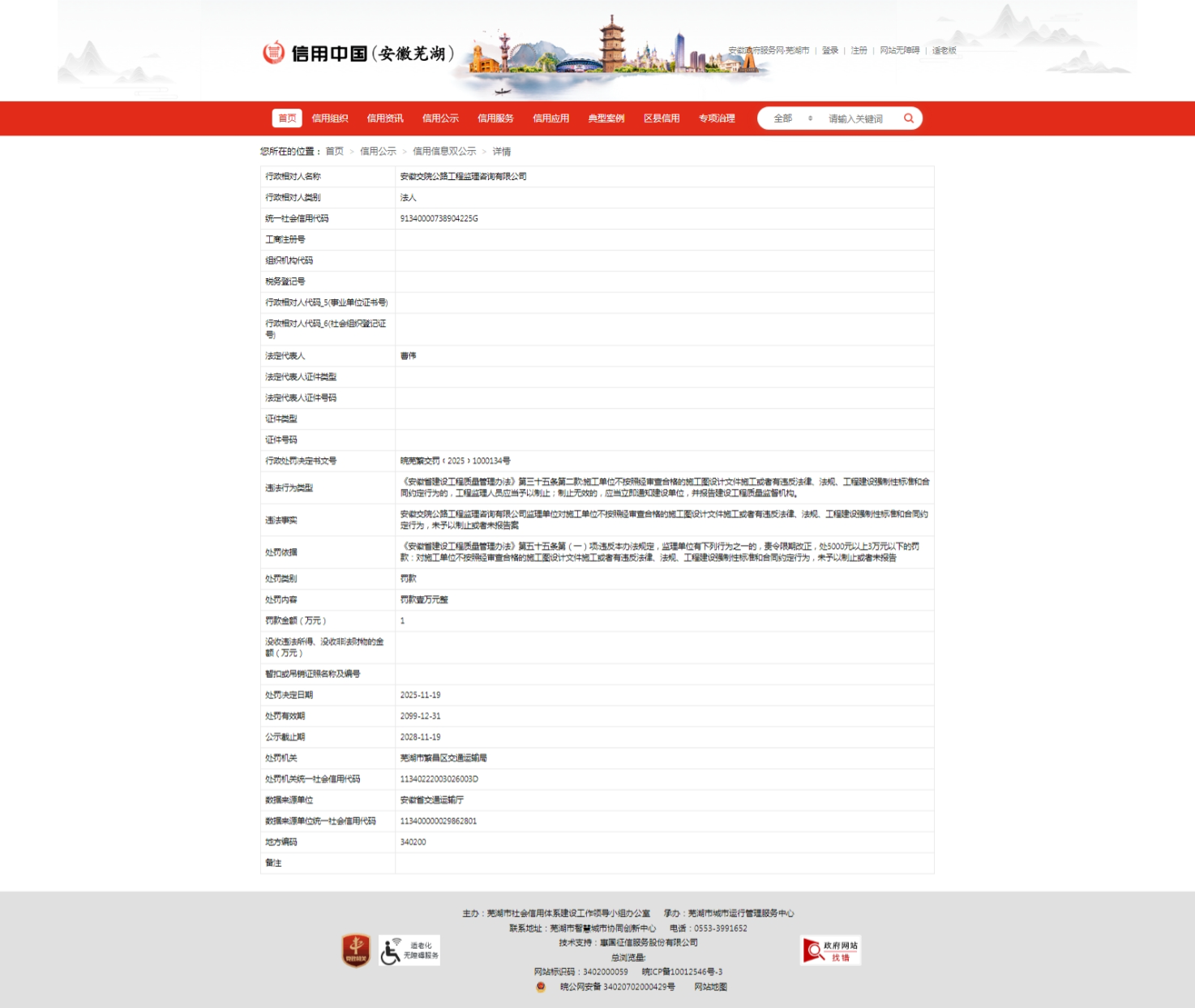 齐鲁晚报·齐鲁壹点记者于信用中国(安徽芜湖)行政处罚信息栏获悉,11月19日,安徽省交通科学研究院旗下的安徽交院公路工程监理咨询有限公司(下称“安徽交院监理公司”)收到罚单,处罚类别是“罚款”,处罚机关为芜湖市繁昌区交通运输局。