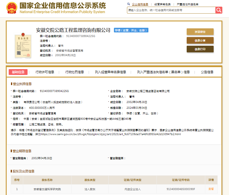 国家企业信用信息公示系统显示,安徽交院公路工程监理咨询有限公司成立于2002年,注册资本400万元人民币,法定代表人曹伟,由安徽省交通科学研究院全资持股,后者则由安徽省港航集团有限公司全资持股。