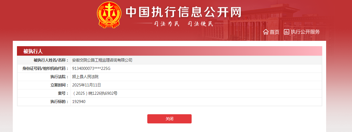 此外,中国执行信息公开网显示,安徽交院监理公司近日成被执行人,立案时间为2025年11月11日,其被颍上县人民法院执行标的192940元,案号(2025)皖1226执6902号。