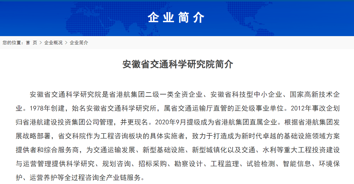 安徽省交通科学研究院则是安徽省港航集团二级一类全资企业,其2012年事改企划归安徽省港航建设投资集团公司管理,并更现名。2020年9月提级成为安徽省港航集团直属企业。