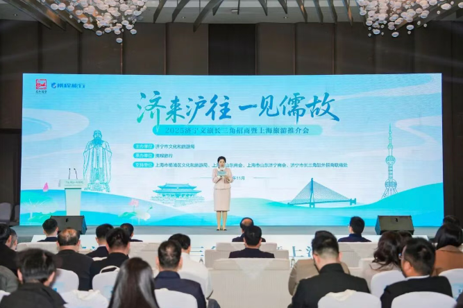 2025年11月27日, “济来沪往 一见儒故”2025济宁文旅长三角招商暨上海旅游推介会在上海举办。本次活动由济宁市文化和旅游局主办、携程旅行承办,旨在深化济宁市与长三角地区的文旅交流,全面推介“孔孟之乡、运河之都”优质旅游资源,推动客源互送、项目合作与产业发展。山东省人民政府驻上海办事处党委委员、副主任马希军,上海市山东商会会长高洪彦,上海市杨浦区文化和旅游局党组副书记、副局长潘家新,携程集团目的地合作副总经理、华东大区总经理费成诚,济宁市文化和旅游局党组书记、局长王磊,上海市山东济宁商会会长张玉杨,济宁市长三角驻外招商联络处负责人武勇,济宁孔子文化旅游集团、济宁市民航事业发展中心、济宁市大安机场有限公司负责同志,以及济宁市各县市区文旅部门负责同志、重点景区、旅行社代表,上海市重点文旅企业、旅行社、投资机构、媒体代表等百余人参加活动。