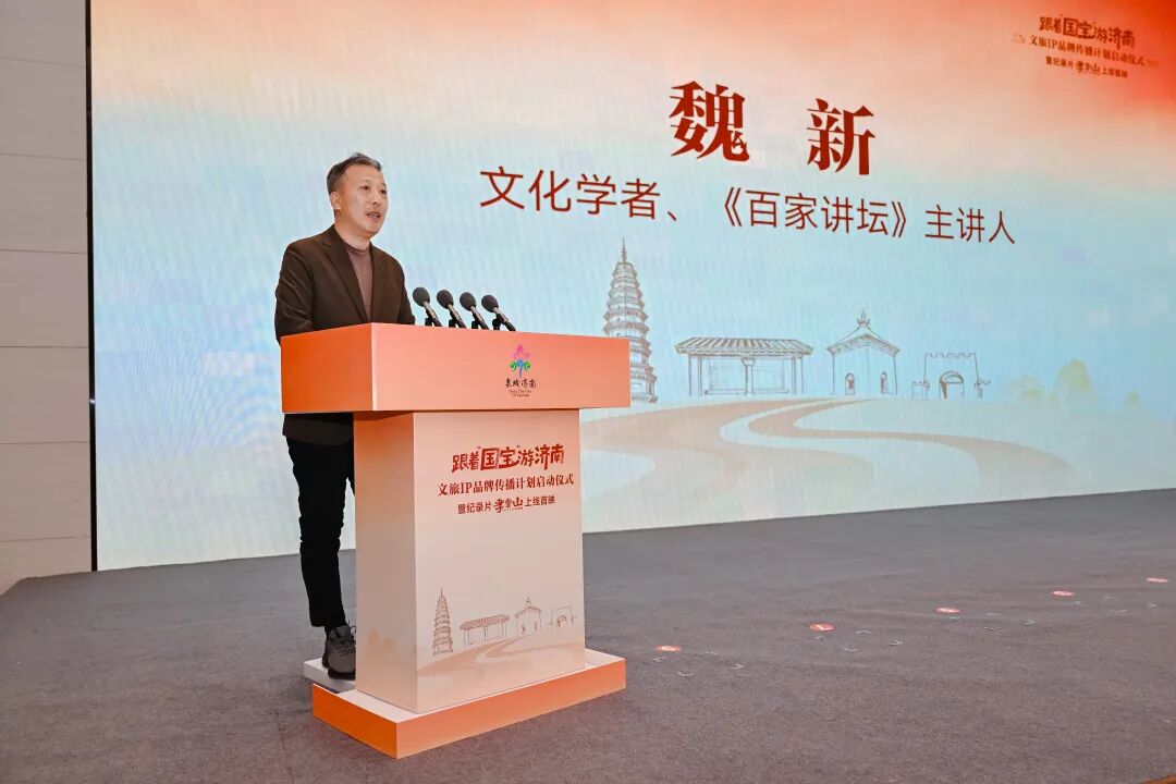 央视《百家讲坛》最年轻的主讲人之一,拥有百万粉丝的文化学者魏新,作为“国宝讲述人”代表发言。他分享了自己与济南历史文化之间的特殊情感,他说,“济南的国宝,与泉水结合得特别完美。跟着国宝游济南,让济南的文旅,拓宽了广度,提高了热度,也给更多人带来了历史的温度。”