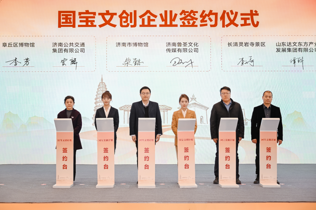 “国宝文创”计划同步启动,济南市博物馆、章丘区博物馆、长清灵岩寺景区分别与三家文创企业举行签约授权。签约企业将根植于“国宝”文物的历史文化底蕴,开发兼具文化内涵、实用价值与审美趣味的文创产品。