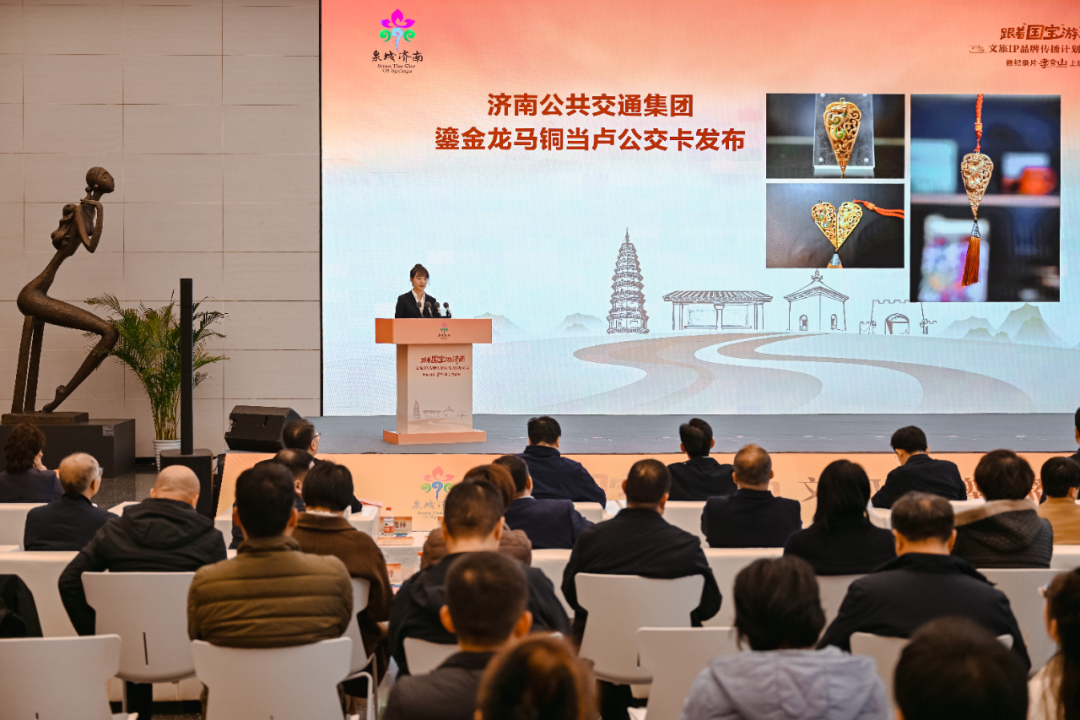 现场,济南公交集团发布了首款示范文创产品——以洛庄汉墓出土的青铜鎏金龙马当卢为灵感的主题文创公交卡。该产品将古代系于马匹额前的青铜饰件文物元素与市民日常出行紧密结合,是文物活化利用、融入生活场景的又一创新实践。该公交卡预计2026年初正式对外销售。
