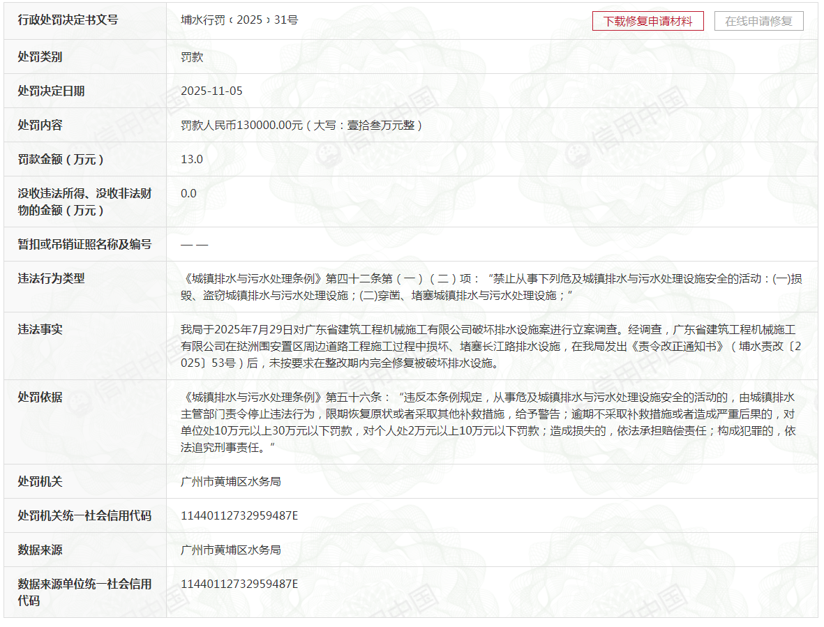日前,信用中国公示了广东省建筑工程机械施工有限公司的行政处罚决定。行政处罚决定书文号 埔水行罚﹝2025﹞31号显示,经调查,广东省建筑工程机械施工有限公司在挞洲围安置区周边道路工程施工过程中损坏、堵塞长江路排水设施,在广州市黄埔区水务局发出《责令改正通知书》(埔水责改〔2025〕53号)后,未按要求在整改期内完全修复被破坏排水设施。依据《城镇排水与污水处理条例》第五十六条相关规定,广州市黄埔区水务局对其作出罚款人民币13万元处罚。