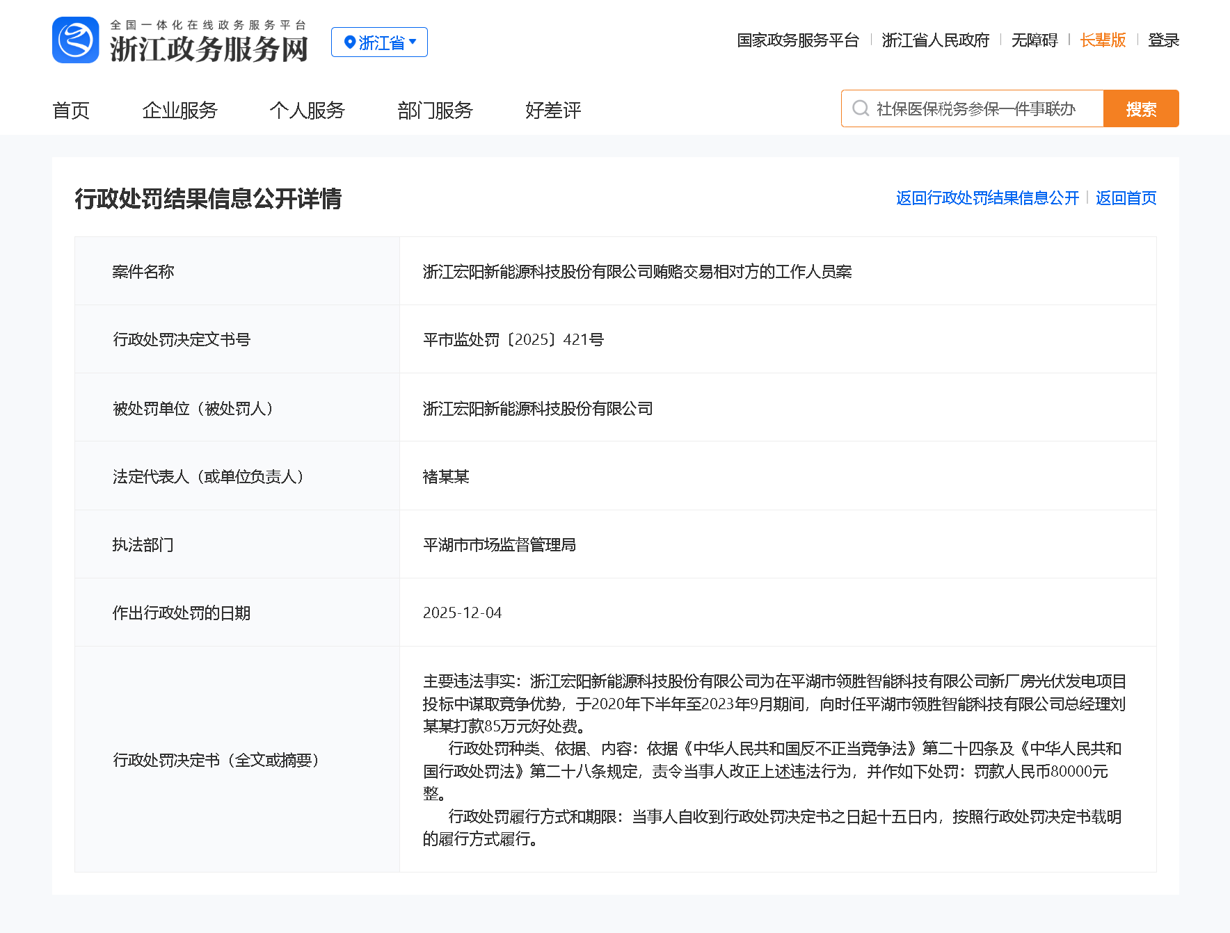 近日,齐鲁晚报·齐鲁壹点记者从浙江政务服务网获悉,浙江宏阳新能源科技股份有限公司因贿赂交易相对方的工作人员案,被平湖市市场监督管理局行政处罚。
