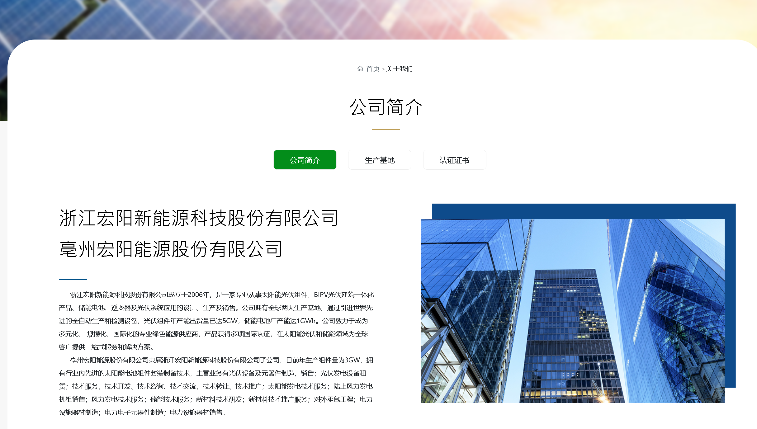 浙江宏阳新能源科技股份有限公司成立于2006年,是一家专业从事太阳能光伏组件、BIPV光伏建筑一体化产品、储能电池、逆变器及光伏系统应用的设计、生产及销售。