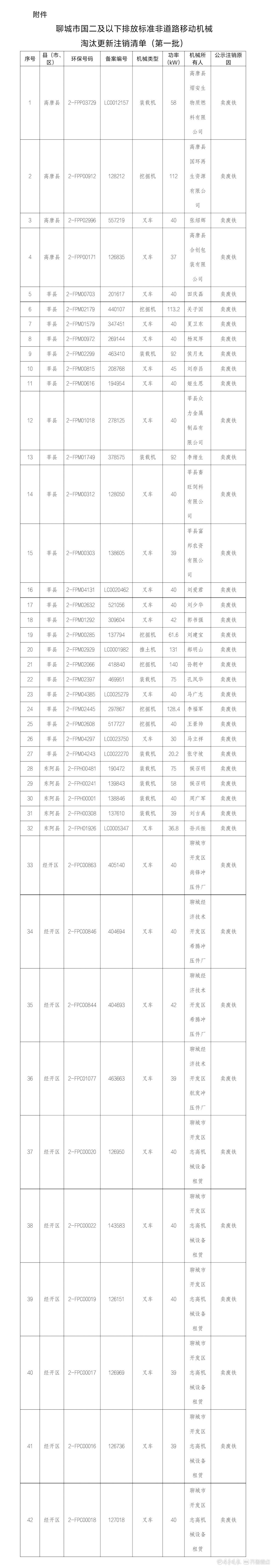 为进一步加强非道路移动机械污染排放管控,加快推进老旧设备淘汰更新,近日,聊城市生态环境局发布首批国二及以下排放标准非道路移动机械淘汰更新注销公示,对42台已符合注销条件的机械设备环保号码予以公示注销。