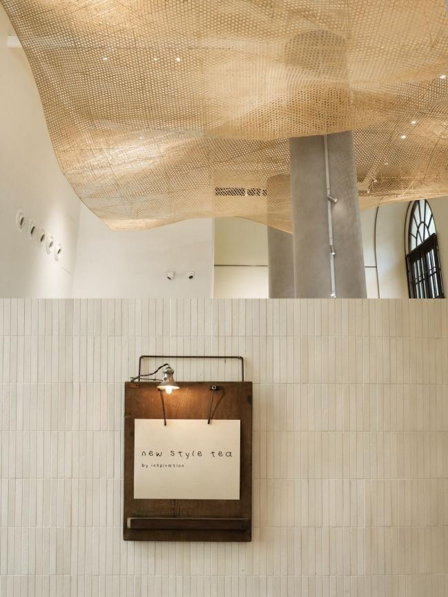 坐落于广州城市文物地标之一的沙面建筑群,喜茶广州沙面DP店选址其中重要历史遗迹渣打银行旧址,延续了DP计划的灵感理念与设计探索,将茶席、茶摊、茶箱、茶铺等场所元素融入空间五感,以现代的设计手法,带来对广府饮茶文化的焕新诠释。喜茶选取饮茶场景中随处可见的竹编元素作为空间表达的载体,覆盖空间顶部的立体竹编装置历时240小时手工编织,竹编形成的纹理在空间内投射出的光影,如同将整间门店搬进树荫下,与门店外古树成荫的沙面大街形成呼应,营造出自然通透的空间感。