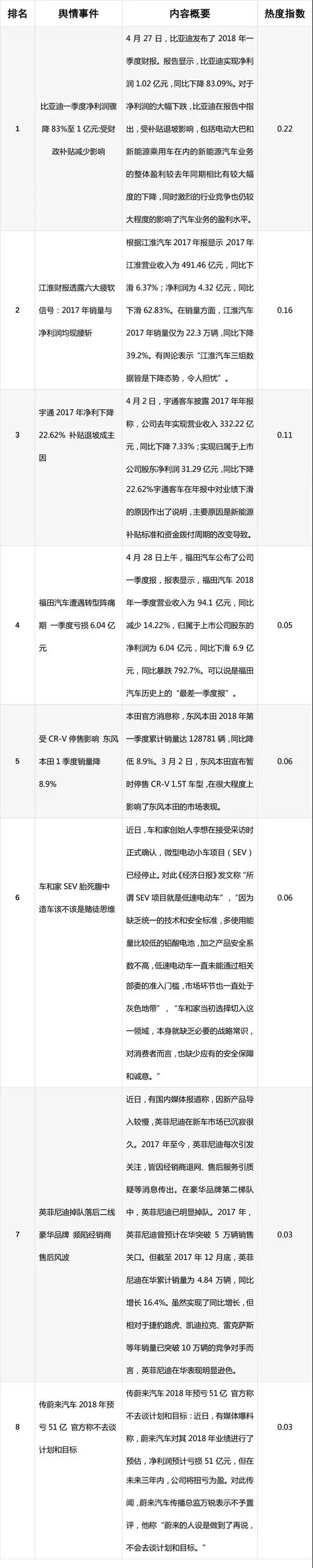 经分析,“比亚迪一季度净利润骤降83%至1亿元:受财政补贴减少影响”、“江淮财报透露六大疲软信号:2017年销量与净利润均现腰斩”、“宇通2017年净利下降22.62% 补贴退坡成主因”成为了成为了4月汽车品牌舆情事件黑榜TOP3事件。