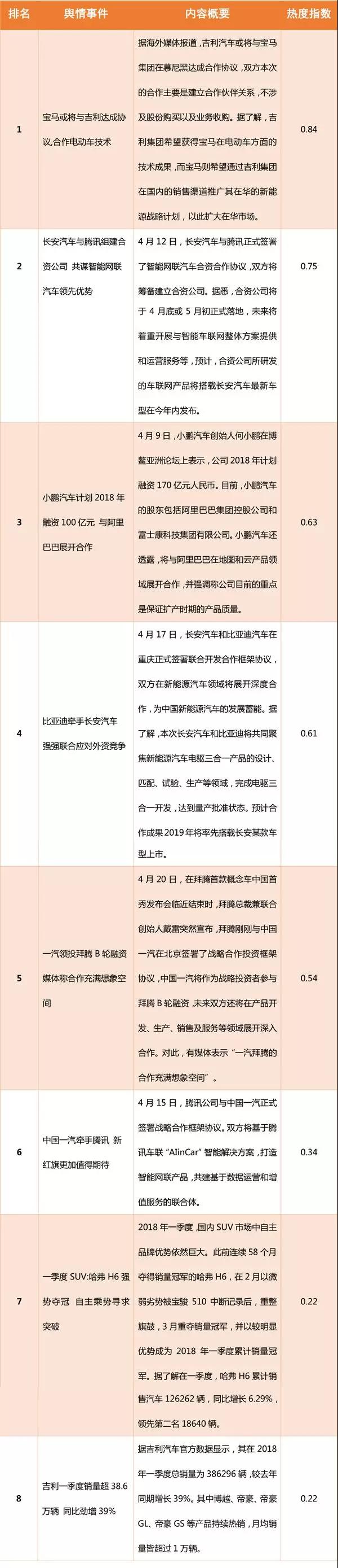 经分析,“宝马或将与吉利达成协议合作电动车技术”、“长安汽车与腾讯组建合资公司 共谋智能网联汽车领先优势”、“小鹏汽车计划今年融资100亿元 与阿里巴巴展开合作”成为了成为了4月汽车品牌舆情事件红榜TOP3事件。
