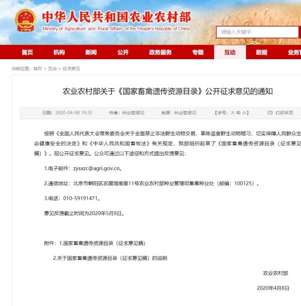 4月8日,农业农村部在其官网公布了《国家畜禽遗传资源目录(征求意见稿)》(简称《目录》)并向社会公开征求意见,《目录》包括家养的传统畜禽和特种畜禽共31个种,列入《目录》的动物,着按照家畜家禽进行管理,可以用于食用等商业利用。