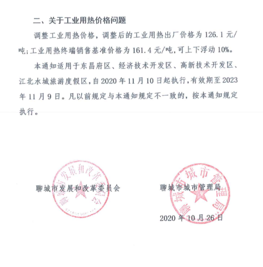 关于工业用热价格问题,调整工业用热价格,调整后的工业用热出厂价格为126.1元/吨 ;工业用热终端销售基准价格为161.4元/吨,可上下浮动10%。