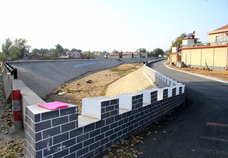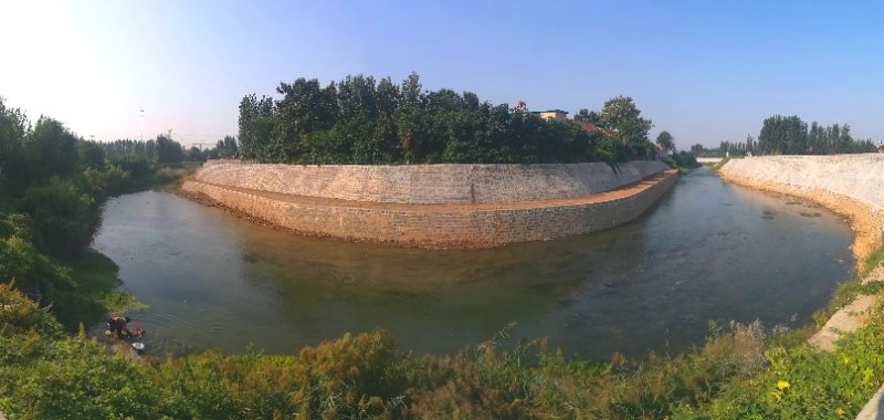 记者沿着河堤走到防洪墙处,河堤上新修葺的护坡,结实又美观,背水面崭新的护坡六棱砖整齐划一,高高的防洪墙像城墙一样坚固屹立。