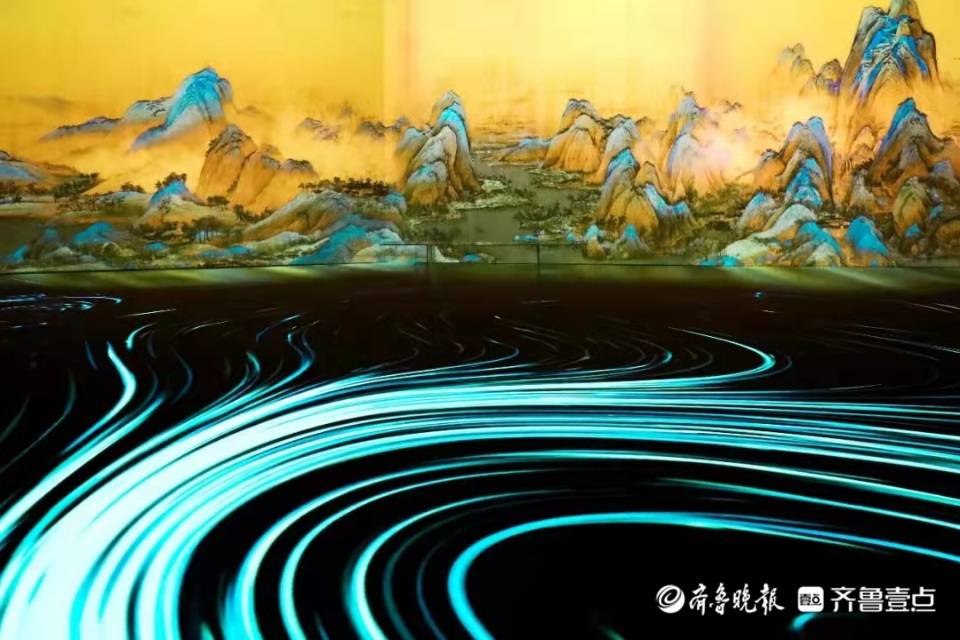 吸引观众的,是这里采用数字动画形式呈现的“活”起来的《千里江山图》。借助高科技手段,将声、光、电与艺术之美结合,观众站在沉浸式展厅之中,王希孟画中的峰峦秀水从四面八方奔涌而来,给予我们全方位的感官体验。