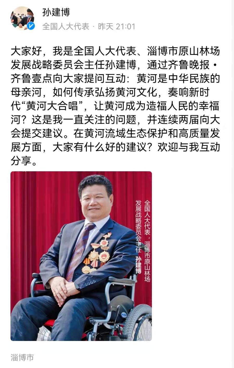 全国人大代表、淄博市原山林场发展战略委员会主任孙建博提问互动:大家好,我是全国人大代表、淄博市原山林场发展战略委员会主任孙建博,通过齐鲁晚报•齐鲁壹点向大家提问互动。黄河是中华民族的母亲河,如何传承弘扬黄河文化,奏响新时代“黄河大合唱”,让黄河成为造福人民的幸福河?这是我一直关注的问题,并连续两届向大会提交建议。在黄河流域生态保护和高质量发展方面,大家有什么好的建议?欢迎与我互动分享。