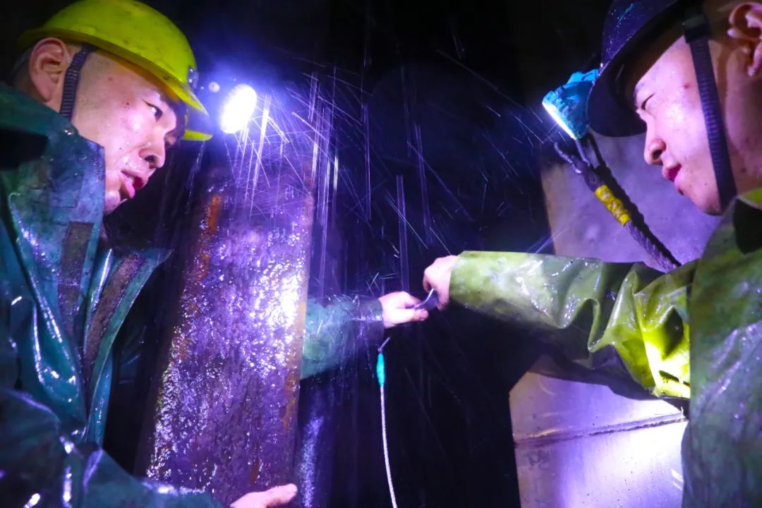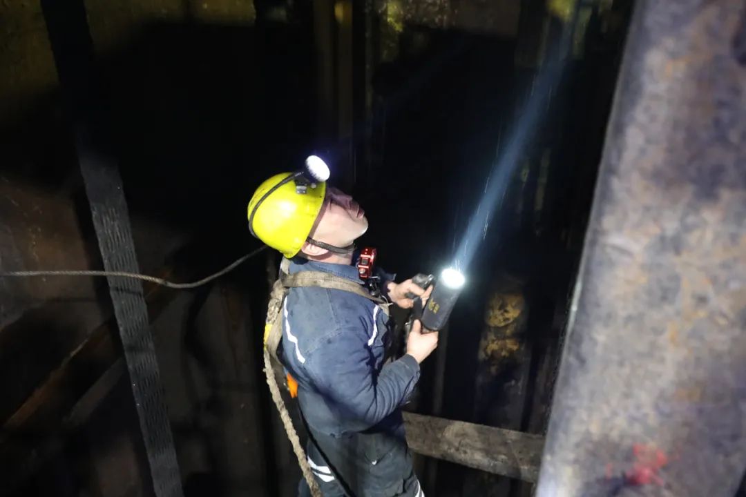 唐口煤业-400米到-800米的位置为含水层,井筒的此段位置淋水多,易造成罐道梁、首绳、尾绳锈蚀。每天排查并处置此段位置的安全隐患是井筒维修班的另一项重要工作。早上9点,上井短暂休息10多分钟后,智能巡检系统检测到井筒-800米处出现故障,孟祥福顾不得喝上一口水,立即招呼工友查贤龙穿上雨衣,乘坐罐笼下降到故障位置。经过仔细排查,原来是罐道梁上一个螺母因生锈松动了。两人将半个身体探出罐笼外,冰凉的淋水如瓢泼大雨般落到身上。“一、二、三……”孟祥福将一把大扳手口固定在螺母上,查贤龙用力按动着扳手壁,当两人更换完螺母再次回到罐笼中时,双手下垂后,袖口的水瞬间一条线流了下来。