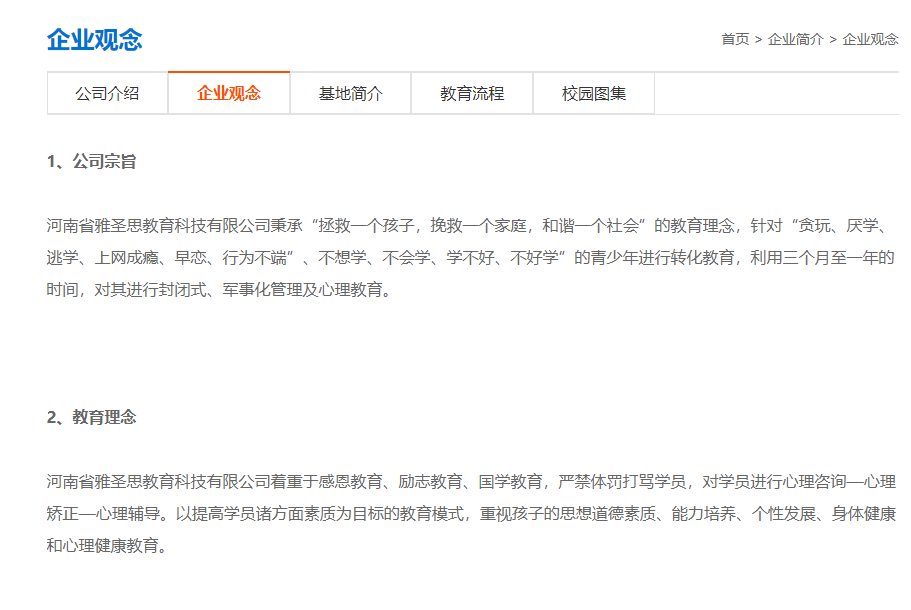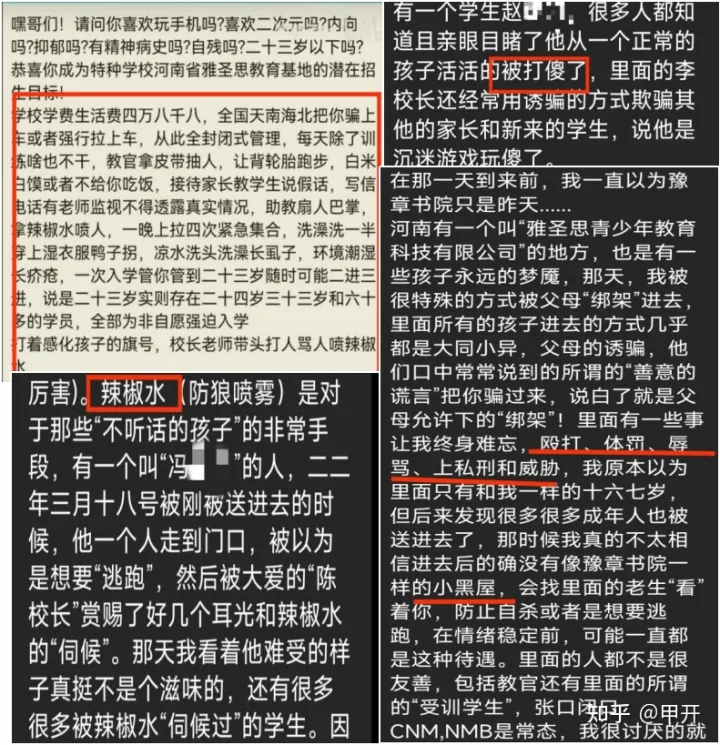 自称在河南省雅圣思素质教育基地学习的网友贴文称:“该校学费生活费共四万八千八,全封闭式管理,每天除了训练啥也不干,教官拿皮带抽人,背轮胎跑步。吃饭是白米白馍或者不给吃饭。接待家长教学生说假话,写信电话有老师监视,不得透露真实情况。”