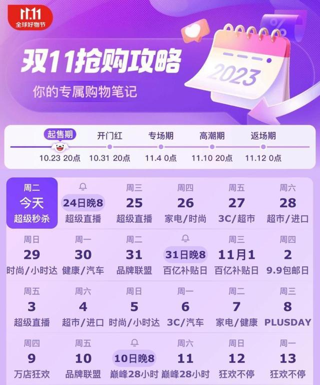 京东还制作了一张“双十一抢购攻略”,如23日是“超级秒杀”,26日是家电/时尚,27日是3C/超市,11月10日和11日则是“巅峰28小时”。10月23日到11月13日每天的主题被安排得明明白白,随时欢迎消费者加入这场销售狂欢。