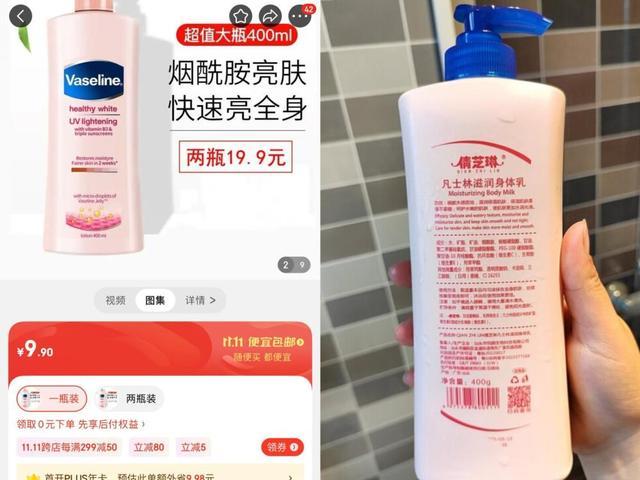 “以往我都在联合利华旗舰店购买,下单后我注意到这家店是一个个人店铺,就点进去看了评论。”一看评论处别的买家晒的实物图,小陈傻眼了:“商品展示页面用的明明是凡士林品牌的图片,但实物和正品凡士林根本不一样,虽然也是粉色瓶子,但瓶子背后写着大大的‘倩芝琳’三个字。”小陈立刻进行了退单。