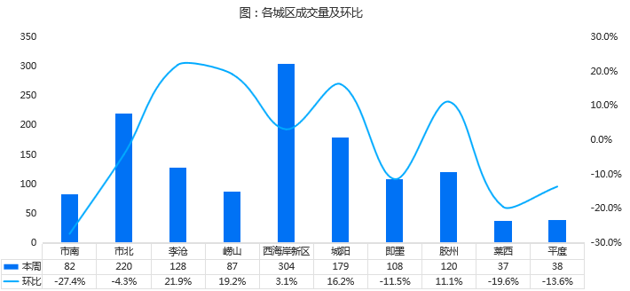 从成交区域来看,西海岸新区以304套的成交量,继续稳居全市首位;市北区排在第二位,成交220套;排在第三位的是城阳区,成交179套。另外,李沧区成交128套,胶州市成交120套,即墨区成交108套,崂山区成交87套,市南区成交82套,平度市成交38套,莱西市成交37套。
