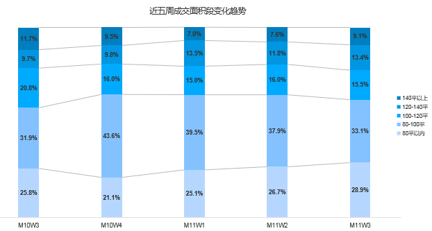 从上周的成交面积柱状图来看,二手房成交面积段中,100平米以下的房源仍占最大比重,为62%。其中,80平米以内的成交28.9%,80~100平米的成交33.1%。另外,100~120平米户型段成交比上涨1.6%,120~140平米户型段成交比上涨1.5%。说明改善群体十分活跃。