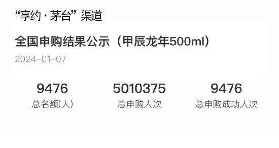 据悉,龙年生肖茅台共开设两个申购渠道。第一,共有5010375人次通过i茅台“享约·茅台”渠道申购龙年茅台,申购成功9476人。这也是i茅台上龙年茅台的常规申购渠道。
