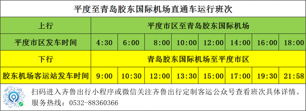 随着客流量的持续提升,为满足更多乘客的出行需求,自2024年1月23日起,平度至青岛胶东国际机场直通车增加车辆、加密班次,进一步优化市民出行体验,运行时刻表如下: