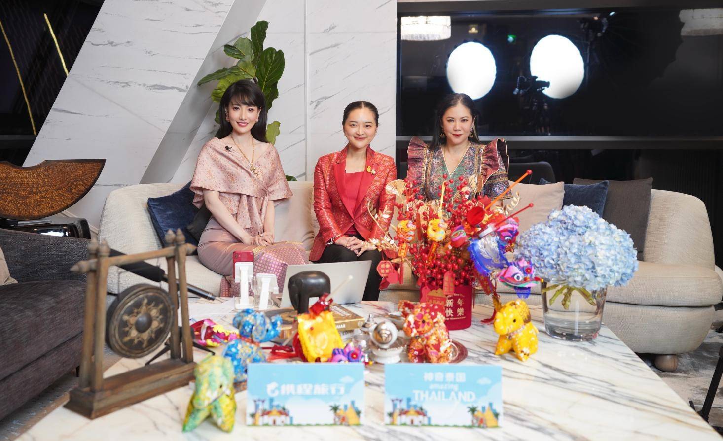 携程集团副总裁孙天旭(左)、泰国旅游与体育部部长素妲婉·汪素帕吉郭颂(中)、泰国国家旅游局局长塔佩妮·佳沛本(右)在携程直播间